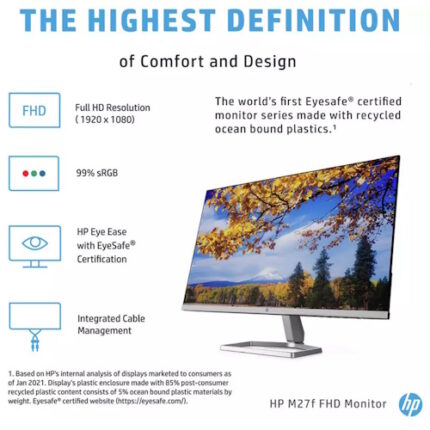 Designed with your comfort in mind: From mastering new skills to diving into a hobby, this 27″ FHD monitor is designed to help keep you focused. With a tilt adjust stand and the Ergonomic Setup Guide[2] in HP Display Center you can customize your comfort. Plus, HP Eye Ease with Eyesafe certication[3] limits blue light to keep your eyes comfortable without impacting color accuracy, so you can do more, longer.