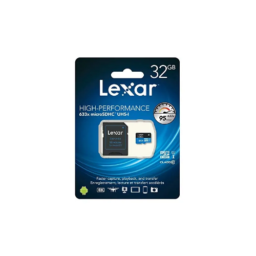 Lexar 32GB High-Performance 633x UHS-I micro SDHC Memory Card supports a maximum read speed of 95 MB/s, a maximum write speed of 20 MB/s, and is able to store up to 36 hours of video, 67,600 photos, or 58,100 songs. Included is an SD adapter, allowing this card to be used in card readers or devices that have an SD slot.